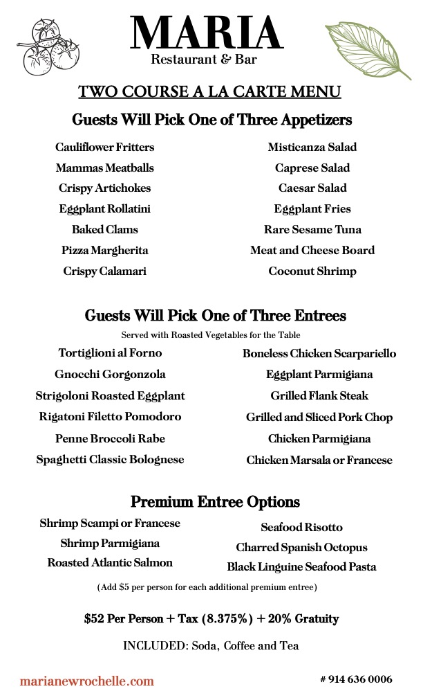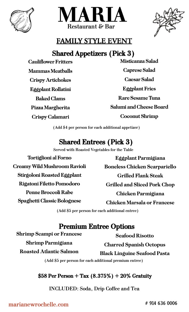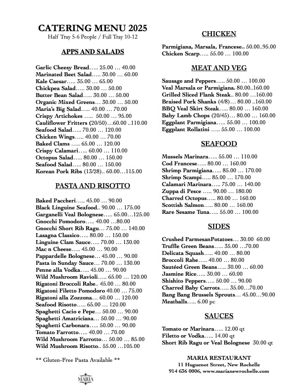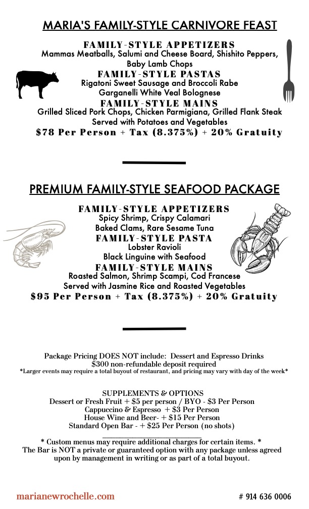 Thank you for considering Maria for your private event. Our restaurant is the ideal venue for a variety of special events offering 7 different Menu Packages (click on "Event Menus" ) as well as a traditional Off-Site Catering Menu (see below).